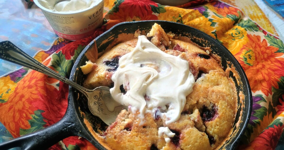 Allow the Cherry Almond Skillet Cake to cool for at least 10 minutes. Dollop with Madagascar Vanilla Crème Fraiche to serve.