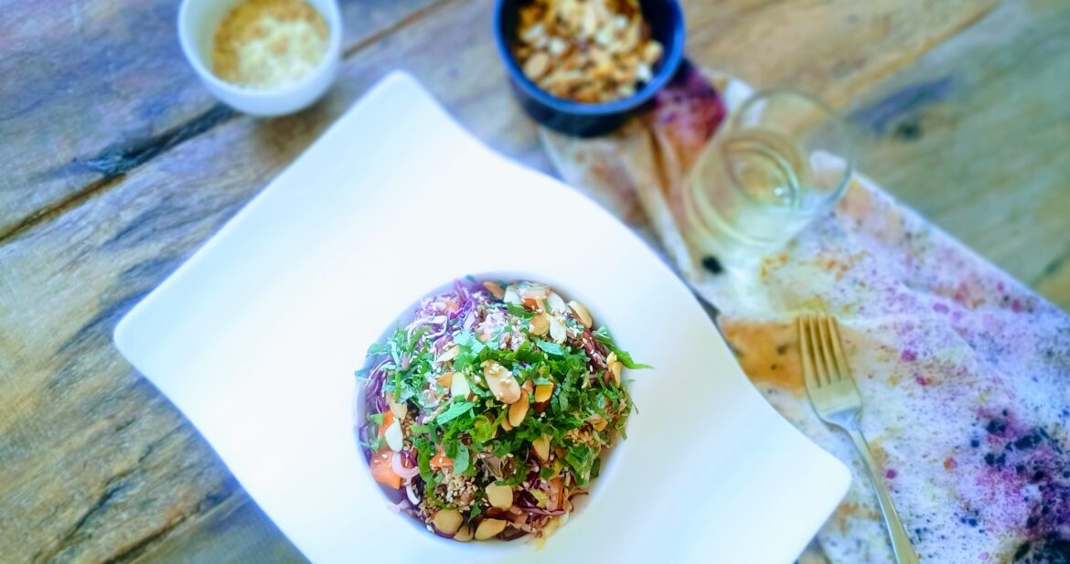 Place the No-Cook Crunchy Asian Cabbage Salad in a large platter. Top with the fresh herbs, the toasted sesame seeds, and almonds. Add a pinch or two of flaked sea salt.